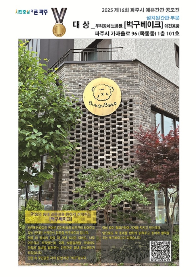 이어 설치된 간판 부문으로는 ▲대상 ‘우리동네 보름달 벅구베이크’(가재울로 96) ▲최우수상 ‘짬뽕인’(책향기로 277) ▲우수상 ‘리ㅤㅂㅢㅤ밀크’(경의로 1080) ▲장려상 ‘수수베이커리’(청석로 266) 등을 선정했다.