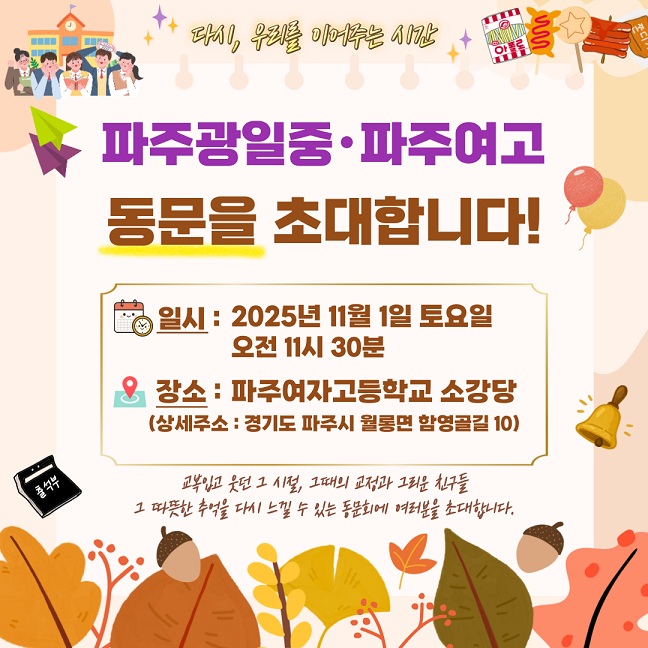 파주 광일중·파주여자고등학교 총동문회(회장 황정희)에 따르면 오는 11월 1일(토)에 파주여자고등학교 소강당에서 다시, “우리를 이어주는 시간”의 주제로 ‘제28회 광일중·파주여고’ 총동문회에 동문을 초대한다.