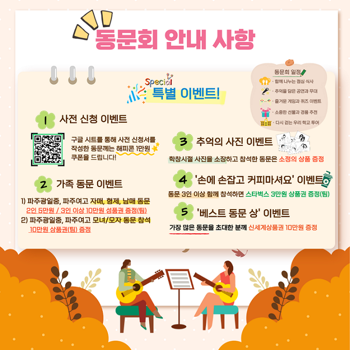 또한 파주광일중 파주여고 자매, 형제, 남매 동문 참석시 2인 5만 원, 3인 이상이면 10만 원권 상품권 증정(팀)과 모녀/모자 동문 참석시에도 10만 원권 상품권을 증정(팀)한다.