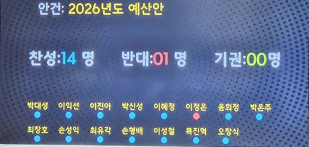 박은주 시의원이 낸 수정안이 찬성 6명, 반대 8명, 기권 1명으로 부결돼 시의회 규정에 따라 예산결산특별위원회로 되돌아가 예결위 수정안대로 총 546억 원이 감액됐다. 사진은 파주시의회 본회의장에 설치된 전자 투표 전광판에 2026 예산안에 대한 의원들의 표결 결과가 나타 나고 있다. 김영중 기자