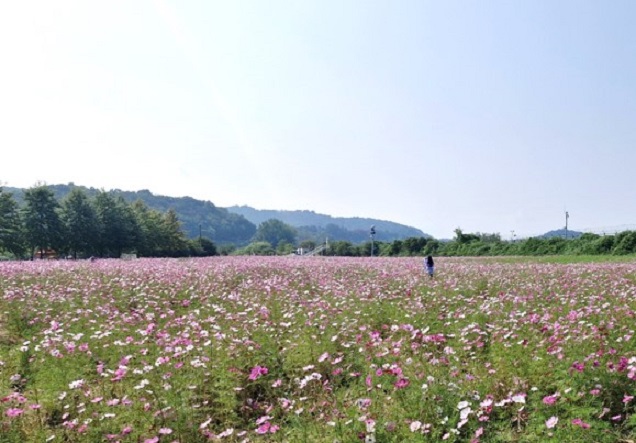파평 율곡습지공원 내 펼쳐진 코스모스 꽃밭 전경. 오는 25일 이곳에서 파평 코스모스축제가 열린다. 사진/파주도시관광공사