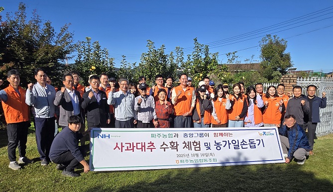 [파주시대 김영중기자]= 중앙그룹은 지난 16일 농협중앙회와 함께 파주읍 백석리에 위치한 사과대추 재배 농가를 찾아 농촌 일손 돕기 봉사활동을 진행했다.