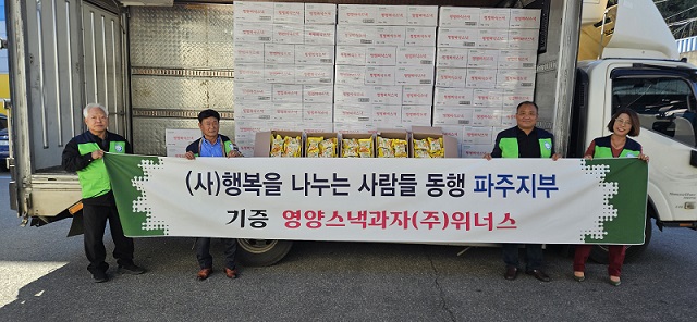 [파주시대 박연진기자]= ‘행복을 나누는 사람들 동행’ 파주지부는 과자 전문제조업체 위너스로부터 1000만 원 상당의 과자 400박스 후원 물품을 기부받았다고 밝혔다.