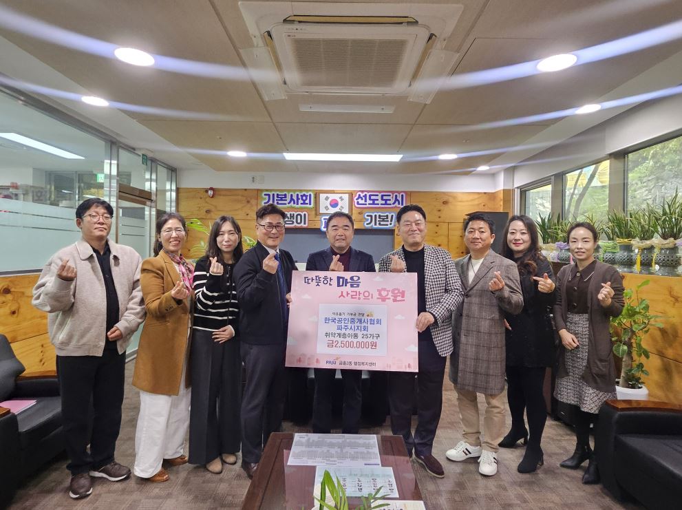 [파주시대 박연진기자]= 한국공인중개사협회 파주시지회로부터 어려운 이웃을 돕기 위해 금촌3동에 성금 250만 원을 후원했다.