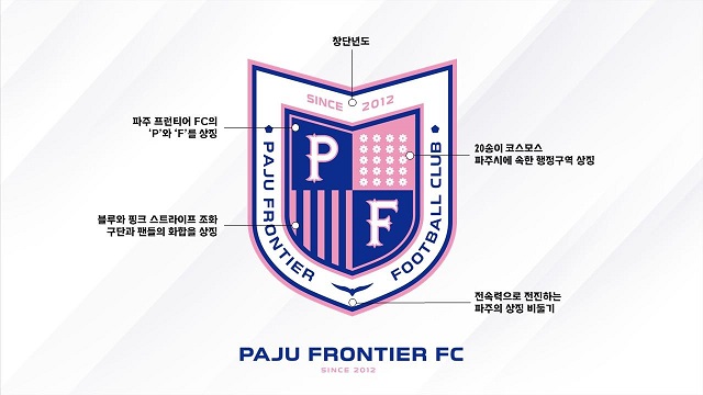 왼쪽에는 구단·애호가(팬)·시민의 화합을 의미하는 줄무늬를, 오른쪽에는 파주시의 20개 행정구역을 상징하는 20송이의 코스모스를 담아 파주시를 대표하는 구단으로서의 정체성을 명확히 드러냈다.