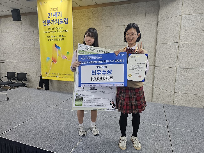 조서연, 김민지, 남궁다원 학생은 11월 8일 안동국제컨벤션센터에서 '2025 전국 사회문제 인문가치 청소년 공모전'에 참가해 사회 현안에 대한 깊은 통찰력을 담은 작품으로 안동시장상에 해당하는 최우수상을 수상했다.