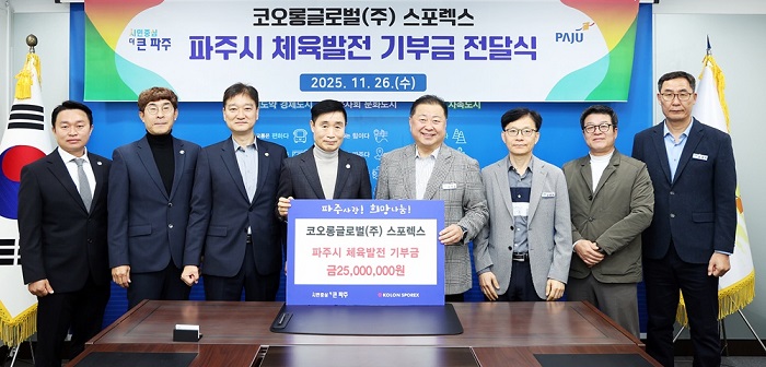 기부금 전달에는 김경일 파주시장, 송승회 코오롱글로벌㈜ 부사장 등이 참석해 지역사회의 체육 기반 강화에 대한 상호 협력 의지를 확인했다.