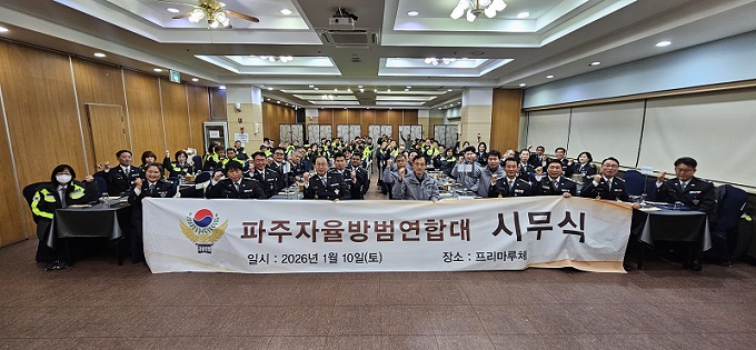 10일 문산읍 소재 프리마루체에서 올해 초 제76대 파주경찰서장으로 부임해 온 장성원 서장, 김형섭 문산지구대장, 150여명의 각 지대 연합대원 등이 참석한 가운데 ‘2026년 파주시자율방범연합대 시무식’이 개최됐다.