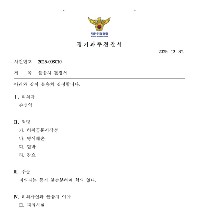 손 의원에 따르면, 파주시 집행부 관계자들이 제기한 허위공문서작성, 명예훼손, 협박 및 강요 혐의에 대해 경찰은 장기간 수사 끝에 증거 불충분을 이유로 불송치 결정을 내렸으며, 검찰 역시 해당 판단을 유지해 사건을 종결했다고 전했다.