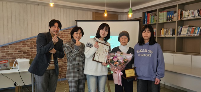 2일 평화원 이준화 원장<왼쪽 2번째>이 김봉녀 어르신<오른쪽 2번째>에게 감사패 전달후 기념사진. 사진/김영중 기자