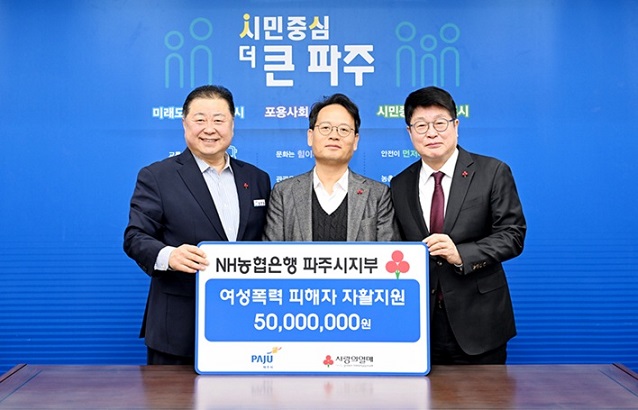 [파주시대 김영중기자]= 파주시는 지난 11일 엔에이치(NH)농협은행 파주시지부가 여성폭력 피해자의 자립과 회복을 지원하기 위한 후원금 5000만 원을 기탁했다고 밝혔다.