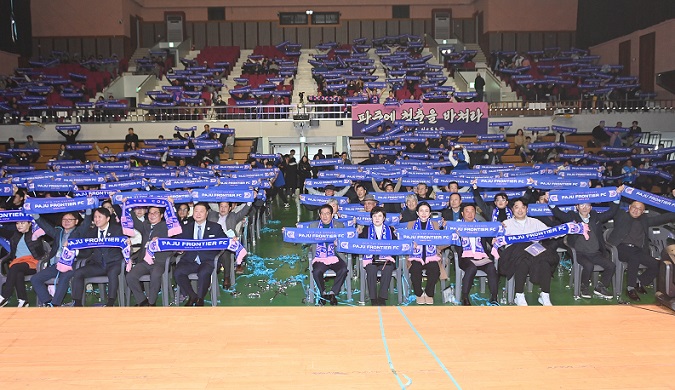 이어 “제가 우리 선수들에게 바라는 것은 단 하나다. 시민들께게 행복한 에너지와 즐거움을 주는 축구, 경기장을 찾은 아이들과 가족들이 웃으며 돌아갈 수 있는 축구를 해달라. 그래서 파주시를 젊음의 열기가 가득한 도시로 축구로 하나되는 도시로 만들어달라”고 당부하며 출정 선언을 했다.
