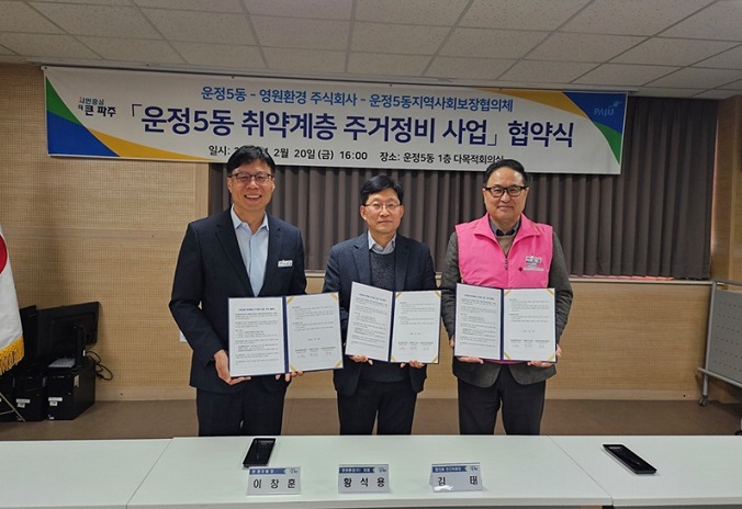 협약에 따라 ▲운정5동은 대상자 발굴 및 행정 지원 ▲영원환경㈜은 생활폐기물 수거 및 주거환경 정비 지원 ▲운정5동 지역사회보장협의체는 봉사·후원 연계 및 현장 협력을 담당할 예정이다.