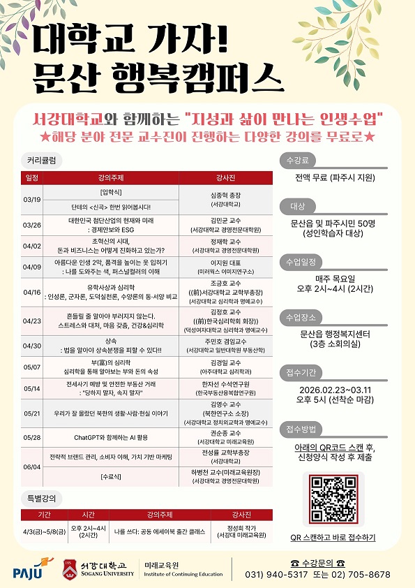 이학현 문산읍장은 “지난해 명지대학교에 이어 올해는 서강대학교와 협력하게 되어 매우 뜻깊게 생각한다”라며, “앞으로도 주민의 삶과 성장을 지원하는 평생학습을 확대해 나가겠다”라고 말했다.