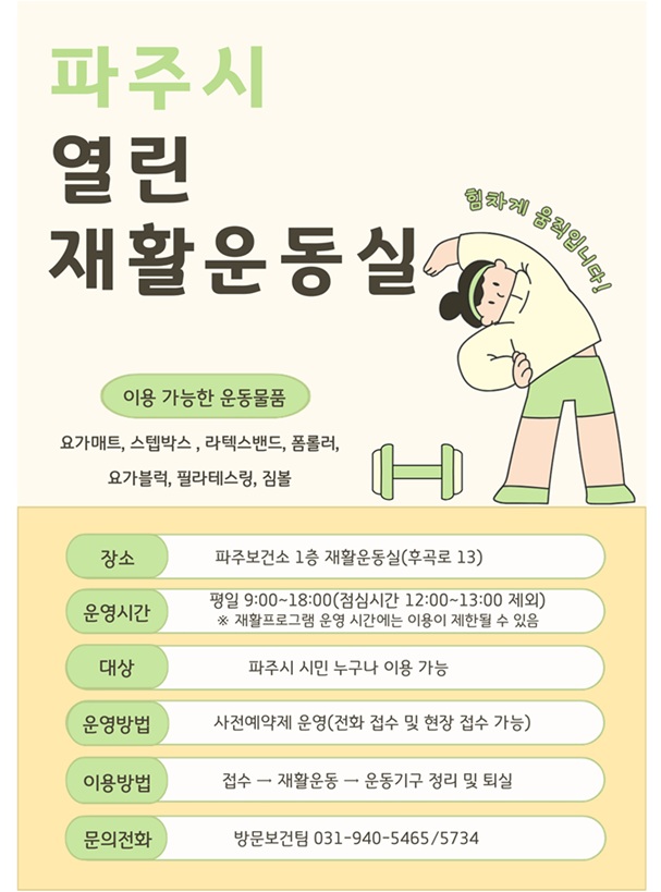 이용을 희망하는 시민은 파주보건소 재활운동실(☎031-940-5465)로 전화하거나 방문해 예약하면 된다.