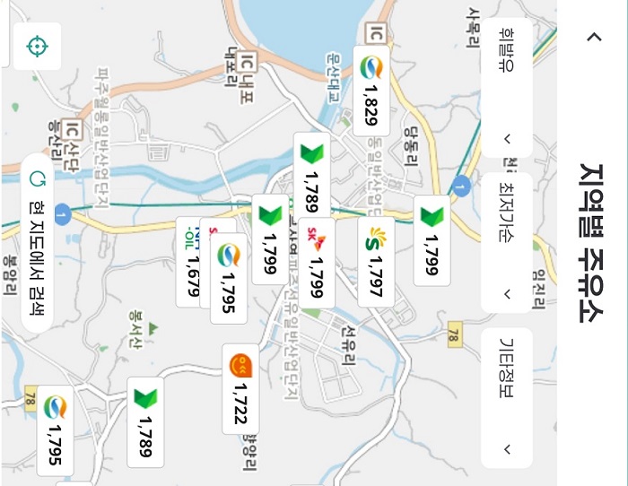네이버 지도에서 나타난 파주농협 인근 10개가 넘는 주유소의 (4일 기준) 유가를 비교해 보면 파주농협 봉서지점 주유소가 1679원인 반면, 일반 주유소의 가격은 적게는 43원에서 많게는 150원까지 차이가 나는 걸 알 수 있다.