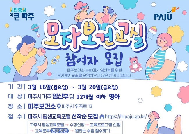 [파주시대 이종석기자]= 파주보건소는 건강한 임신과 출산, 행복한 육아를 지원하기 위해 4월부터 운영하는 ‘모자보건 프로그램’ 참여자를 모집한다.
