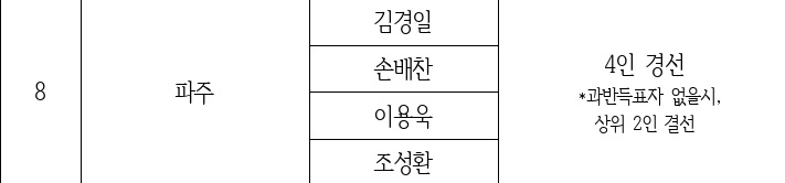 국민의힘은 고준호, 박용호 예비후보로 결정됐으며 이재홍, 안명규, 전정일은 컷오프로 결정났다.
