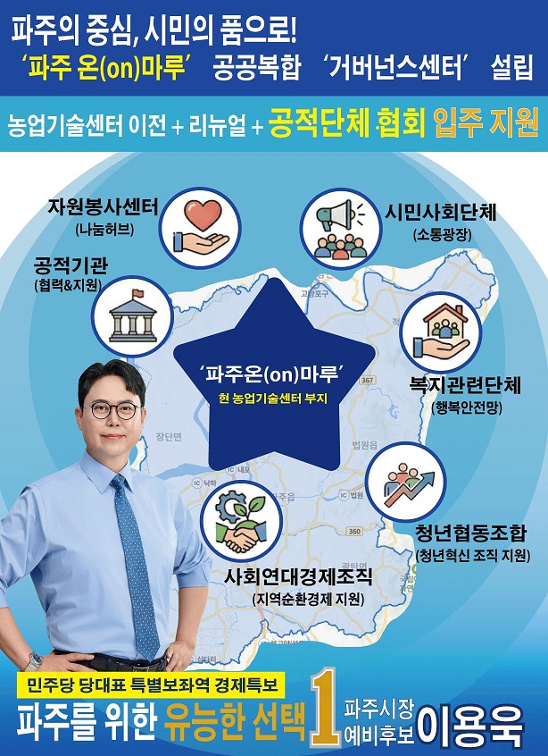 [파주시대 박연진기자]= 이용욱 더불어민주당 파주시장 예비후보는 농업기술센터를 문산권으로 이전한 이후 기존 부지를 활용해 시민 참여형 복합공간 ‘파주 온(On)마루’를 조성하겠다고 밝혔다.