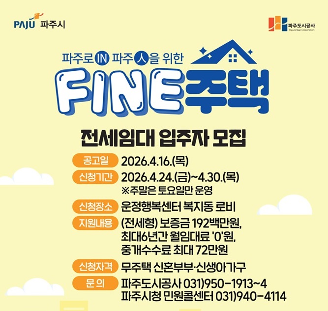 신청은 4월 24일부터 30일까지 운정행복센터 복지동(와석순환로 415)에서 방문 접수로 진행되며, 자세한 사항은 파주도시공사 및 파주시 누리집, 마이홈포털에서 확인할 수 있다.