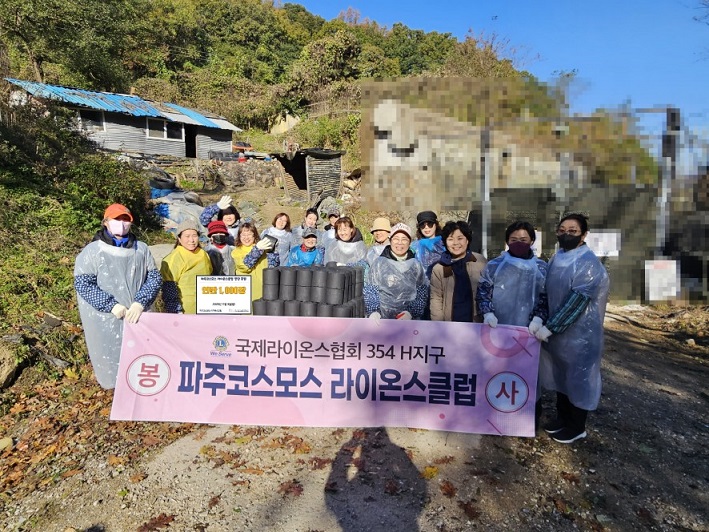 [파주시대 박연진기자]= 국제라이온스협회 354-H지구 3지역 파주코스모스 라이온스클럽(회장 유용숙)은 지지난 3일 연탄 1,000장을 구입, 지역 내 저소득 가정을 위해 ‘따뜻한 겨울나기 연탄나눔 봉사활동’을 진행했다.
