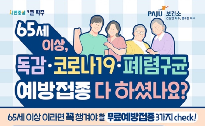 [파주시대 김영중기자]= 파주시는 겨울철 호흡기 감염병 확산에 대비해 65세 이상 어르신을 대상으로 독감(인플루엔자), 코로나19, 폐렴구균 예방접종 3종을 안내하며 접종 참여를 당부했다.