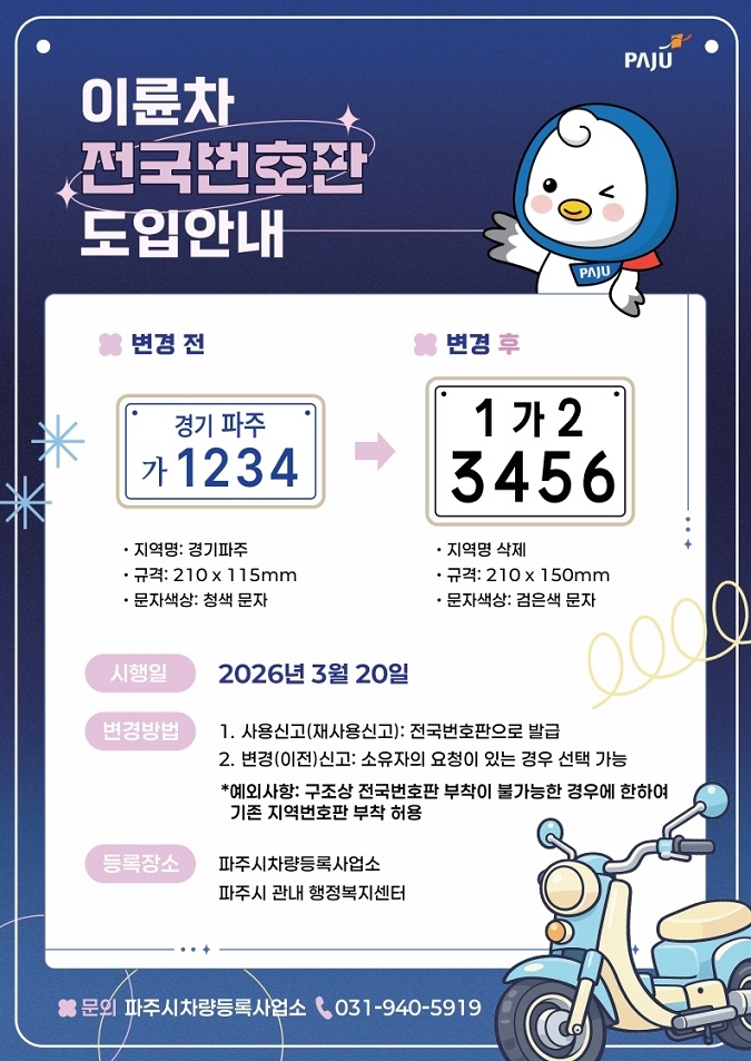 파주시에 따르면, 이번 제도는 국토교통부의 ‘자동차 등록번호판 등의 기준에 관한 고시’ 개정에 따른 것으로, 기존 이륜차 번호판의 식별성을 높이고 행정 관리의 효율성을 강화하기 위해 도입됐다.