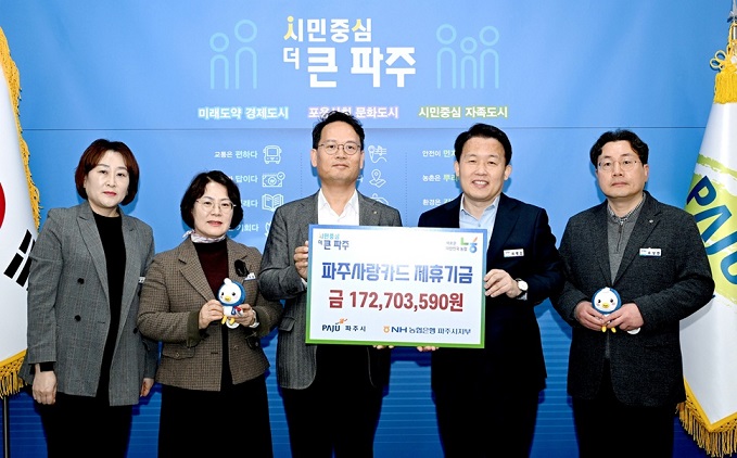 17일 전달된 제휴카드 기금은 파주시와 NH농협은행 파주시지부가 업무협약을 맺고 파주사랑카드, 보조금카드 이용액의 0.2~1%를 기금으로 적립해 조성한 금액이다. 전달된 기금은 파주시의 지역개발사업, 복지사업, 후원사업 등 지역 발전에 사용될 예정이다.
