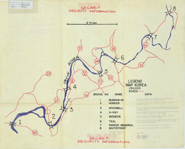 ▲ 임진강 주변 길과 다리 표시 지도(출처, 미국 국립문서기록관리청)