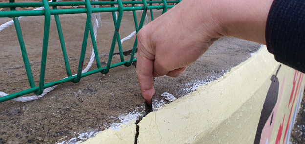 ▲ 손가락이 들어갈 정도의 폭으로 균열이 발생한 웅담초교 기초 옹벽 구조물의 모습