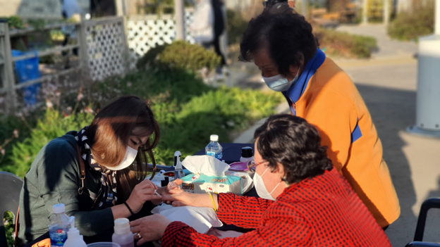 마을회관 주변에는 포토존 설치, 술이홀도서관(책읽기)와 특히, 페이스페인팅 부스에서는 한평생 농사일로 무뎌진 할머니 손톱에 네일아트로 예쁘게 치장해 생전 처음해보는 것에 어르신들은 마냥 신기해했다.