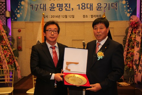 이임하는 윤명진<사진 오른쪽> 전회장에게 1년간의 노고에 대해 윤기덕 신임회장이 공로패를 수여했다.
