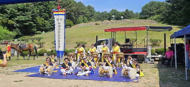 광탄 풍물패의 사물놀이패 공연이 진행되고 있다. 뒤로 보이는 것이 이유길 장군의 묘역이다. 사진/김영중 기자