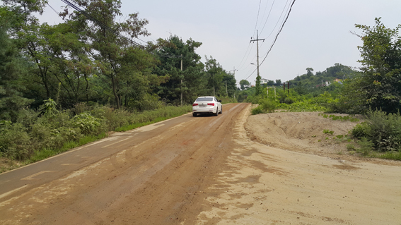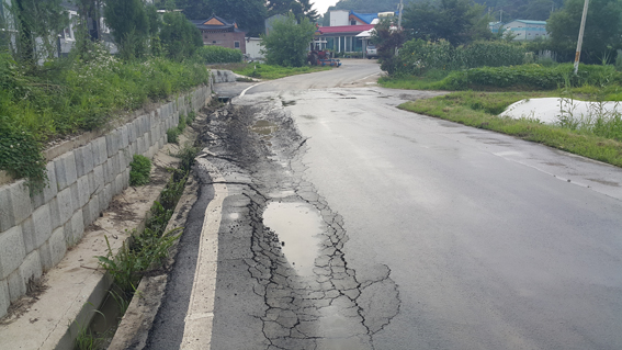 더욱이 마을도로는 파주시민의 세금으로 공사를 마무리한 하수관거 작업구간으로 한달전 아스콘 포장을 끝낸 도로이다. 폭염에 아스콘이 뜨겁게 달아올라 중량이 무거운 차량이 지나가면서 아스팔트 도로가 힘없이 밀려나 배수로까지 덮힌 상황이다.