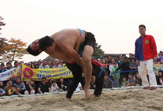 ▲ 제11회 파주개성인삼축제에서 최고의 인기 프로그램으로 자리잡고 있는 씨름대회에서 광탄면의 정한솔 선수가 금촌2동의 박상훈 선수를 들배지기로 멋진 승부를 가르며 청년부 우승을 차지했다.