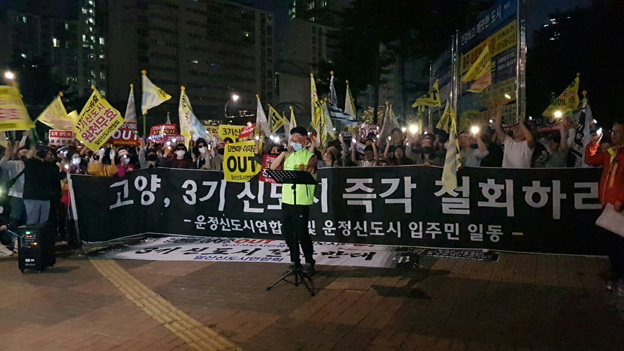 파주 운정신도시 주민들이 수도권 3기 신도시(고양 창릉지구) 건설에 강력히 반발하는 촛불집회를 연 가운데 “정부는 3기 신도시 즉각 철회하고 운정신도시를 자족도시로 완성하라”고 외쳤다.