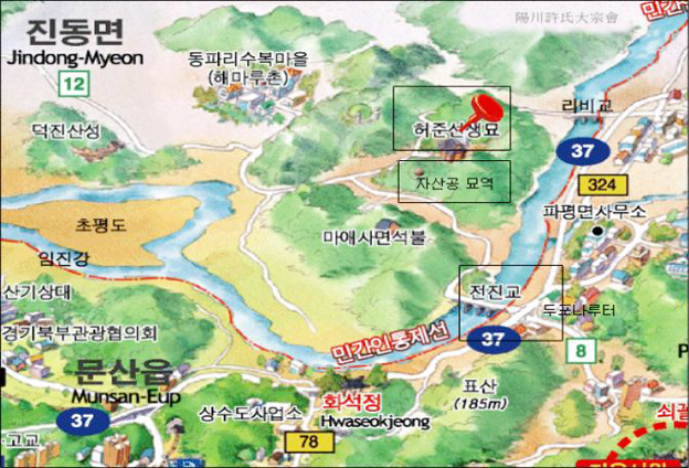 ▲ 허준 선생 묘 위치도. 그 아래 자산공 묘역은 홍길동의 저자 허균의 조부모 묘소이다.