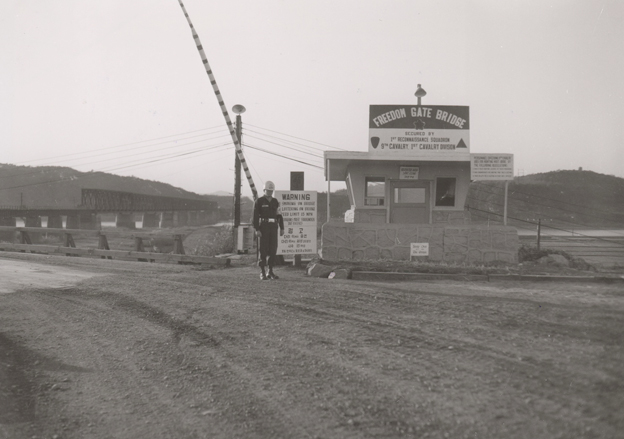 ▲ 1962년에 촬영한 자유의 다리. 검문소 표지판에 ‘모든 한국인은 도민증을 제시할 것’이라고 적혀 있다. (출처, 미국국립문서기록관리청)