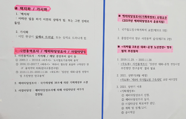 조후보는 12일 자신의 선거사무실에서 가진 4차 정책브리핑에서 “기획재정부의 예비타당성조사 운용지침(2019)에 의하면, 예비타당성조사 신청 위해서는 사전용역조사(제27조 2항)와 국가철도망구축계획에 반드시 포함(제26조 5항) 돼야만 한다. ‘지하철3호선 대화~운정 노선연장’ 사업이 진행되기 위해서는 2019년 11월 국토부에 의해 다시 추진되고 있는 사전용역 결과가 2020년 11월 나와야 하며(제27조 2항), 또한 2021년 상반기에 국토부가 발표하는 제4차 국가철도망구축계획에도 반드시 포함(제26조 5항)돼야 한다”고 설명했다.