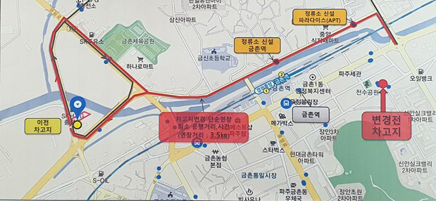지난 22일 파주시와 금촌3동 주민들에 따르면, 해당 운송업체인 S여객 3개 노선 799번(금촌~서울역), 100번(금촌~불광동), 333번(금촌~구파발)은 기존 금촌동 신안아파트 인근(신성교통) 차고지에서 최근 파주시청 제설차량기지 앞(금촌동)으로 이전했다.