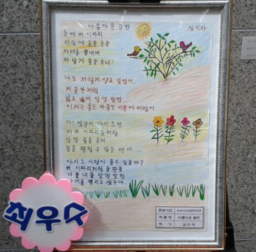 김미자 할머니는 작품에서 ‘아름다운 들판’이라는 주제로 출품해 인생의 서글픔과 자식에 대한 내용으로 이제와 몸이 늙어 하고 싶은 것 다하지 못하는 아쉬움을 표현해 가슴을 여미게 했다.