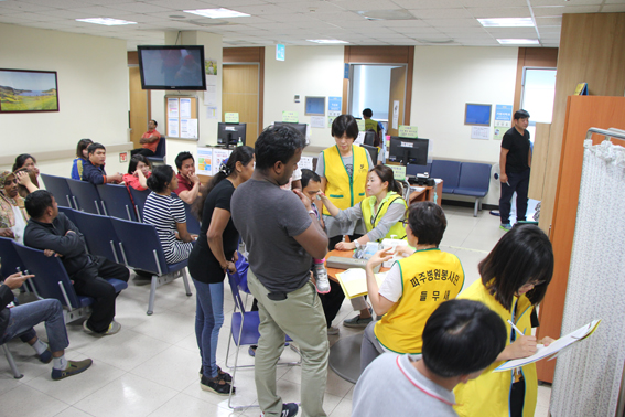 또한 파주병원(원장 김현승) 들무새봉사단체(단장 성영호 가정의학과장)가 접수부터 진료실 안내 등 혈압측정과 혈액검사를 도와주고 있다.