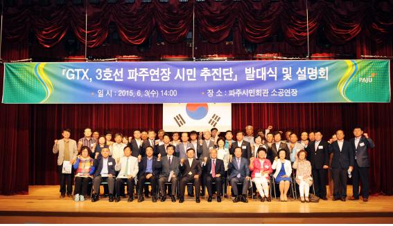 작년 6월에는 GTX와 3호선을 파주까지 연장하기 위한 「GTX, 3호선 파주연장 시민 추진단」이 발대식을 갖고 도ㆍ시의원, 교육분야, 지역대표, 사회단체분야, 관내 기업분야, 문화?예술?체육 분야 등 모두 98명으로 구성돼 혼신의 노력을 하고 있다.