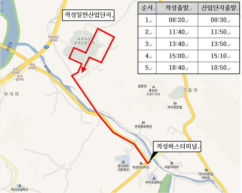 시 관계자는 “적성산단 출?퇴근 버스 노선이 신설됨에 따라 근무자들의 출?퇴근 여건 개선에 큰 도움이 될 것”이라며 “앞으로도 수요자 중심의 정책을 통해 교통 불편해소에 최선을 다 하겠다”고 말했다.