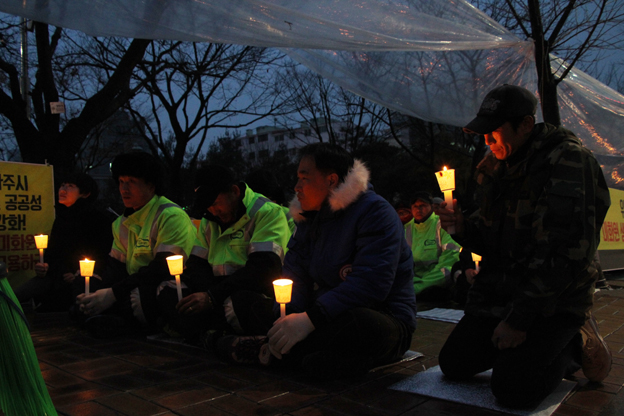 ▲청소노동자비상대책위원회(위원장 권성식)는 22일 민간위탁 전면 중지를 요구하는 촛불집회를 파주시청 앞에서 60여명의 노동자들과 시민들이 함께했다.